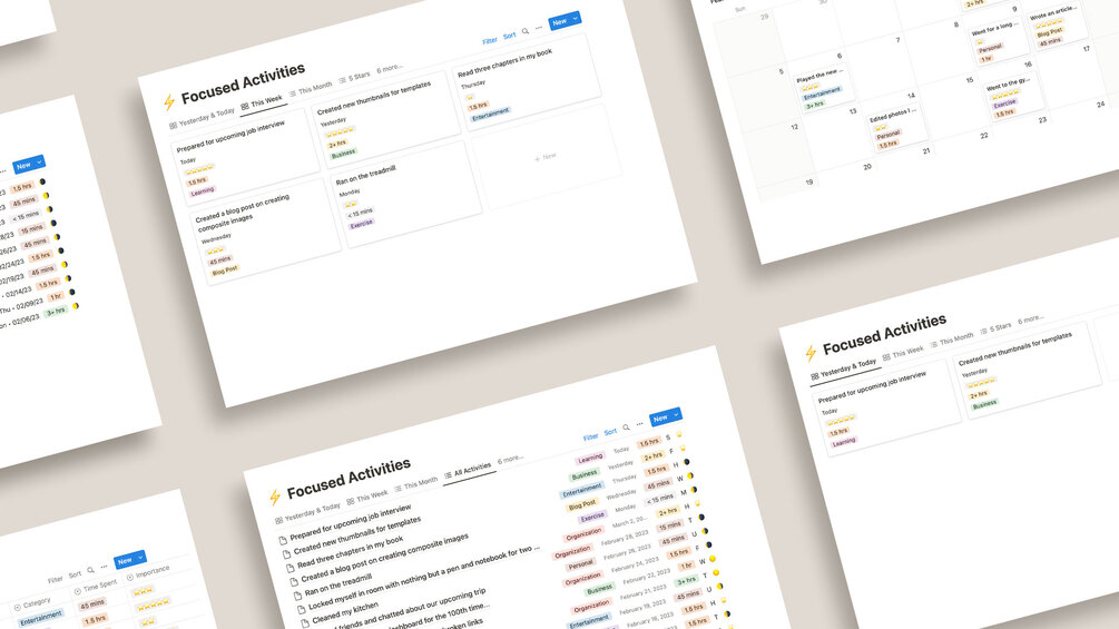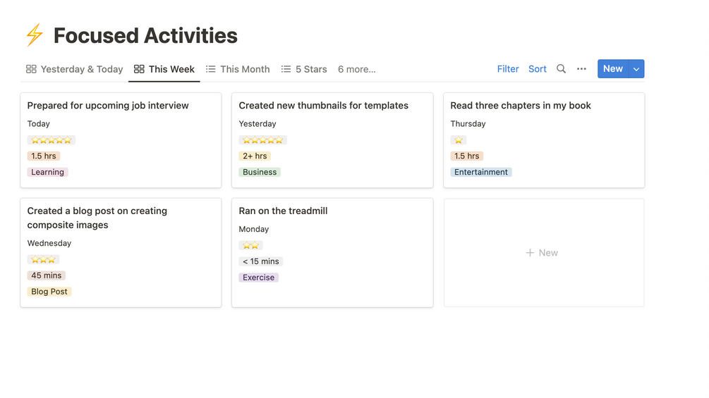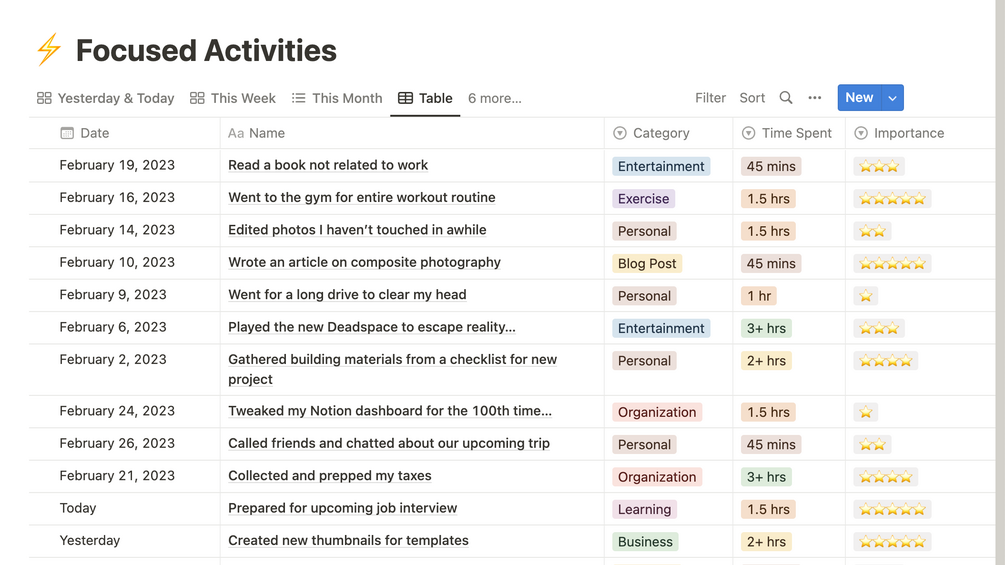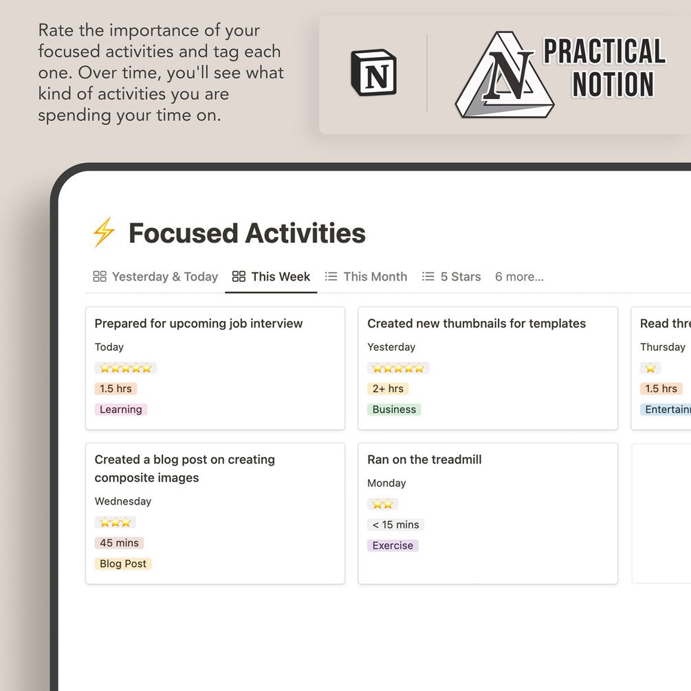 Rate the importance of your focused activities and tag each one. Over time, you'll see what kind of activities you are spending your time on. Each view uses a filter that automatically creates today's date, so tracking is automated.